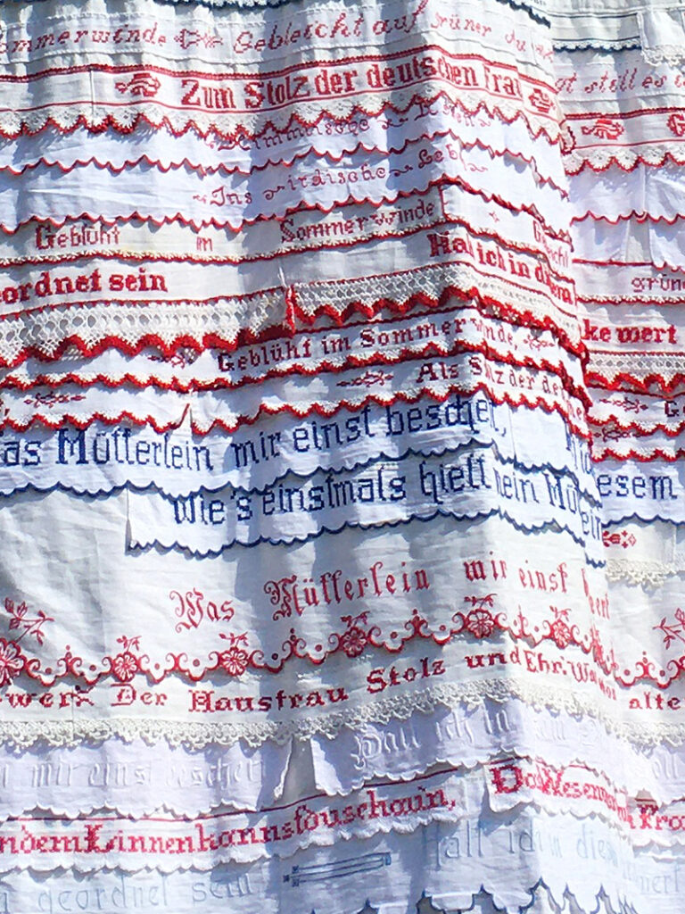 Aus Leinentuch meiner Uroma nähe ich ein Kleid. Den Saum zieren dutzende von Hand gestickte Spruchbänder. Wieder und immer wieder, ein umlaufendes Mantra – Sei fleißig.